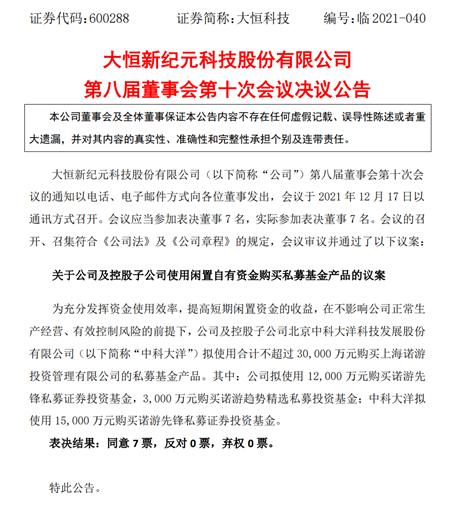 12月18日,大恒科技发布公告称,为充分发挥资金使用效率,提高短期闲置资金的收益,在不影响公司正常生产经营、有效控制风险的前提下,公司及控股子公司北京中科大洋科技发展股份有限公司(以下简称“中科大洋”)拟使用合计不超过 30000 万元购买上海诺游投资管理有限公司的私募基金产品。其中:公司拟使用 12000 万元购买诺游先锋私募证券投资基金,3000 万元购买诺游趋势精选私募投资基金;中科大洋拟使用 15000 万元购买诺游先锋私募证券投资基金。