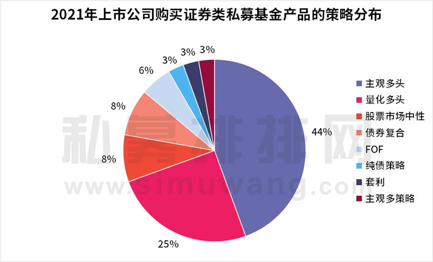在这些获上市公司认购的产品中,以主观多头产品的数量最多,达到16只。量化多头产品其次,达到9只。还有市场中性、债券复合产品各3只。其他涉及的策略包括FOF、纯债策略、套利、主观多策略等。