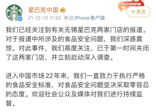 针对此事,@星巴克中国 在13日发布声明称,“我们已经关注到有关无锡星巴克两家门店的报道。对于报道中所涉及的食品安全问题,我们深感震惊。”