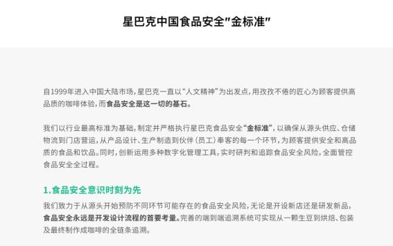 星巴克在中国的成功,一方面是品牌战略的成功,但也建立在长期出品的稳定之上。在《星巴克食品安全“金标准”》中,它清晰地标注: