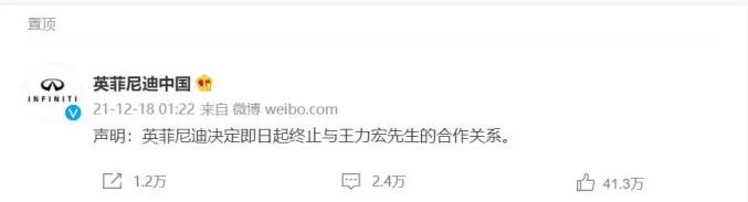 12月18日凌晨1点22分,@英菲尼迪中国 发布声明:“英菲尼迪决定即日起终止与王力宏先生的合作关系”。而就在两天前,即12月16日,英菲尼迪才刚刚官宣王力宏成为品牌代言人。
