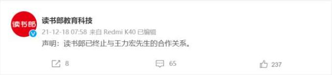 此后,@读书郎教育科技 也发表声明:“读书郎已终止与王力宏先生的合作关系。”