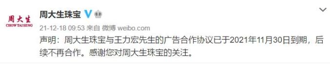 18日上午,@周大生珠宝 发布声明:周大生珠宝与王力宏先生的广告合作协议已于2021年11月30日到期,后续不再合作。感谢您对周大生珠宝的关注。