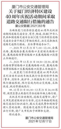 为确保厦门经济特区建设40周年庆祝活动期间道路交通安全、有序、畅通,依据《中华人民共和国道路交通安全法》《厦门经济特区道路交通安全若干规定》等相关规定,决定采取相关道路交通限行措施。具体事项通告如下: