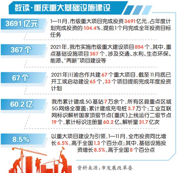 以重大基础设施项目为引领,重庆投资实现持续较快增长。1—11月,全市投资同比增长6.5%,高于全国1.3个百分点;其中,基础设施投资增长8.5%,高于全国8个百分点,是全市投资持续恢复最稳定、最重要的支撑;市政府工作报告重点强调的科技创新、成渝双城、现代产业、城市提升领域,重大项目建设分别完成年度计划投资的118.4%、104.8%、104.4%、100.8%。