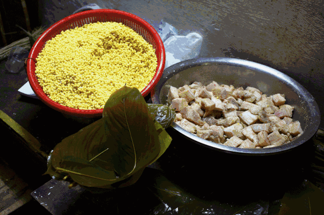 新鲜出炉的裹蒸,糯米表层吸收了冬叶的叶绿素,呈现一层通透的浅绿,冬叶与糯米、绿豆混合的清香令人垂涎欲滴,松化甘香,口感软滑,吃后齿颊留香,肥而不腻,风味独特。