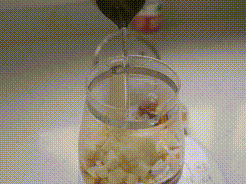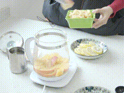 5、将橙子果肉倒入养生壶中,挤压出汁,倒入其余水果
