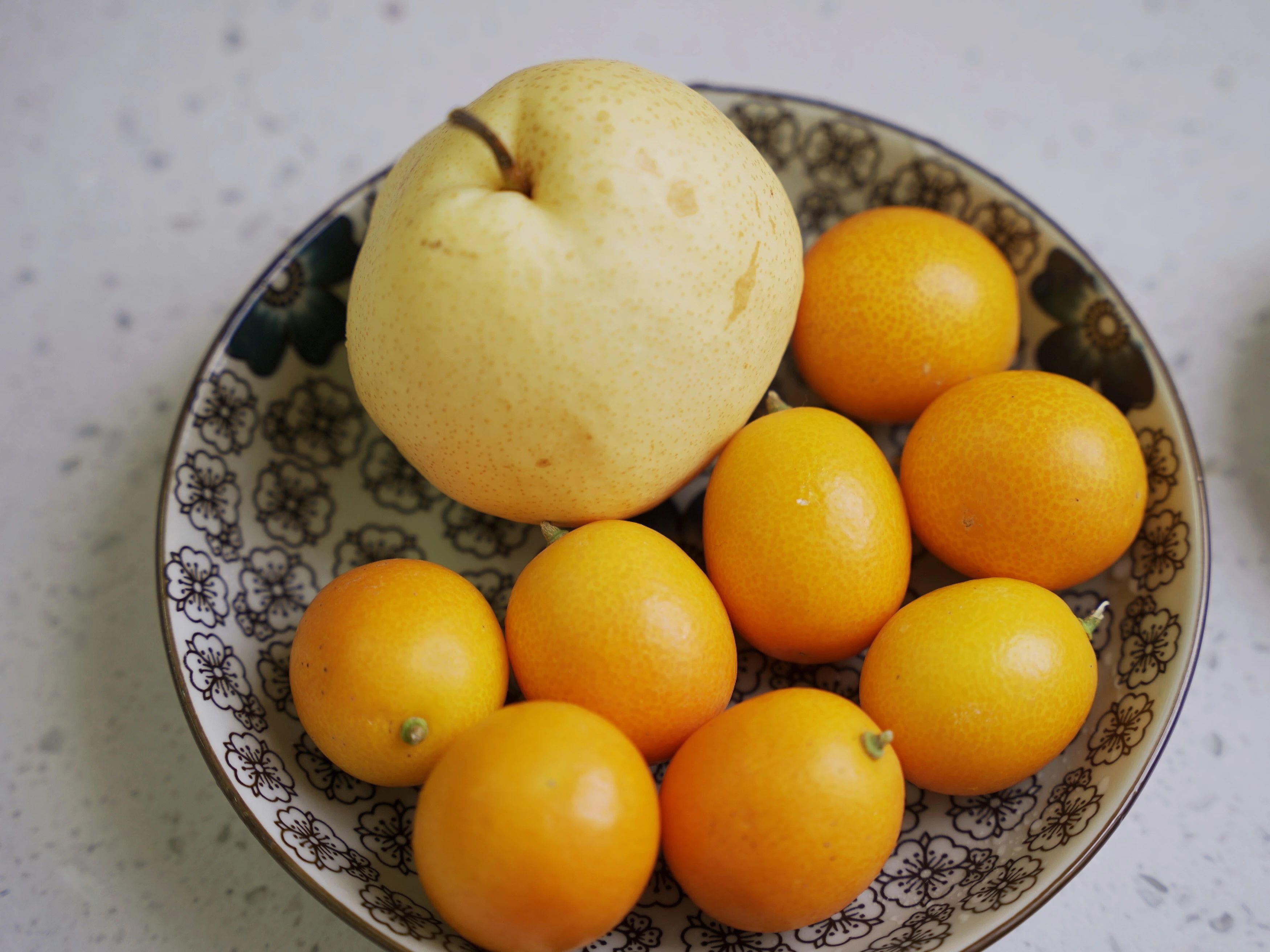 雪梨1个,金桔10颗,红枣若干,枸杞若干,冰糖少许
