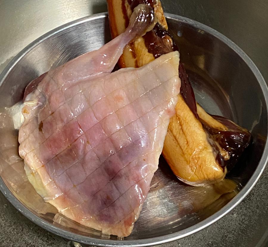 2.腊鸭腿,五花腊肉预先蒸制15分钟,蒸出来的油脂留着,后面要用到。