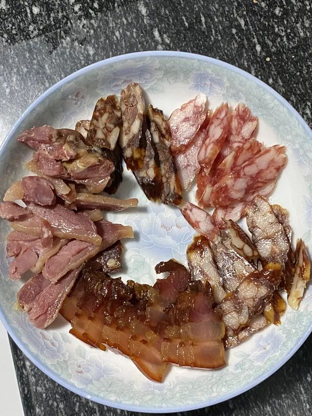 1.腊味切薄一点有利于油脂析出。