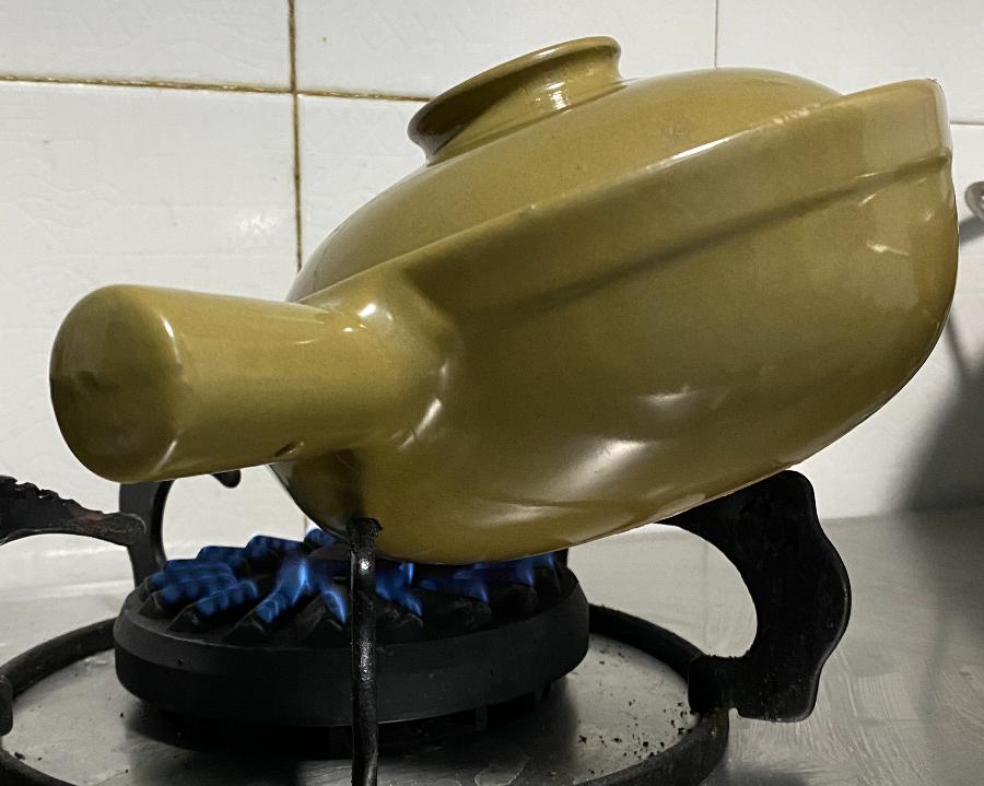 5.倾斜砂锅用微火煲制四边,每边烘烤3分钟。全程不能打开锅盖。