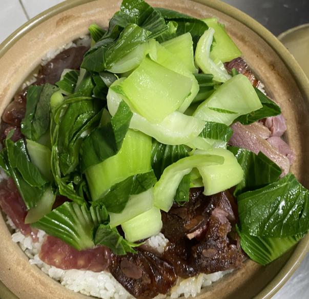 6.四边烤制完毕后,倒入烫熟冲凉的青菜(也可以打入一个鸡蛋,即为窝蛋腊味煲仔饭)加盖煲制1分钟。