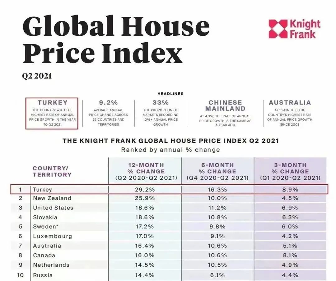 国际私营房地产顾问机构莱坊(Knight Frank)近日发布报告称:2021年前两个季度,土耳其房价涨幅居全球首位,高达29.2%,是全球平均水平的三倍多!