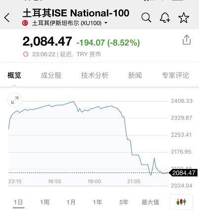 截至收盘,土耳其主要股指收跌8.5%,为3月以来的最大单日跌幅。