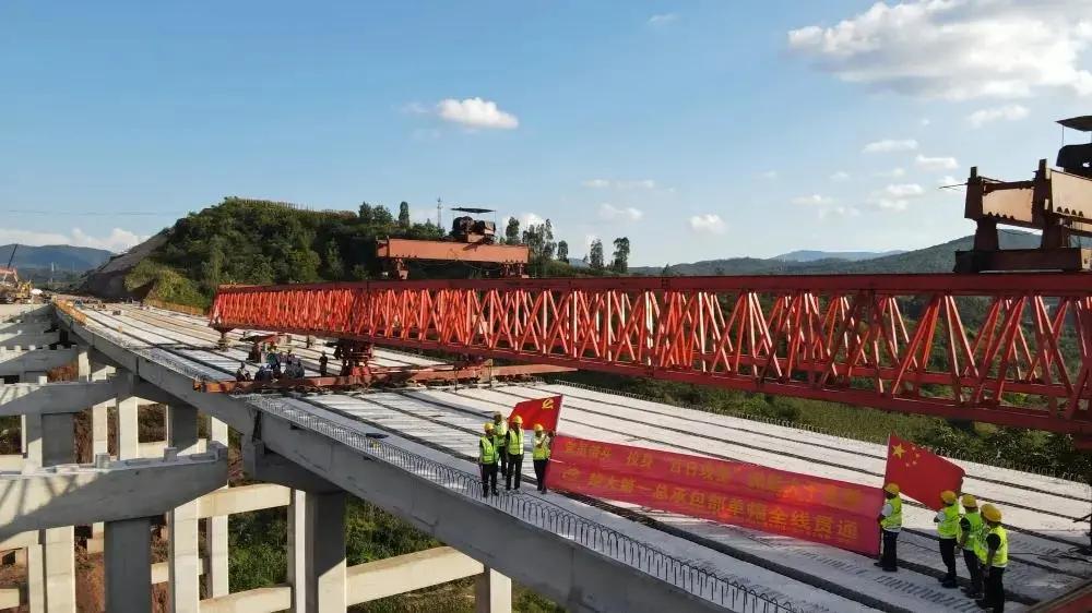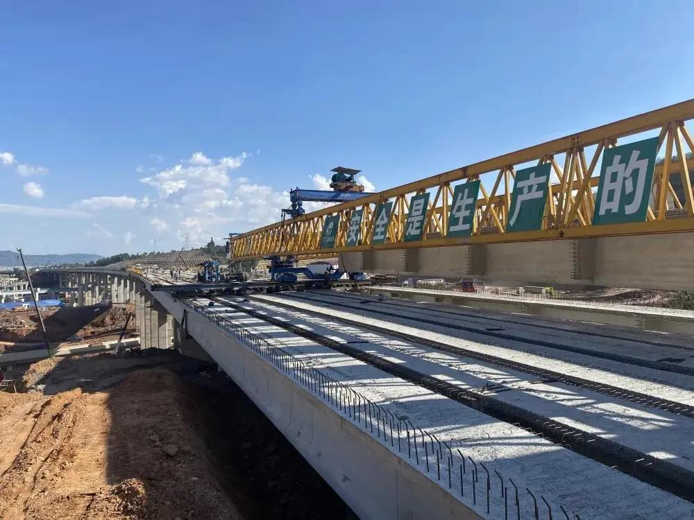2021年9月10日上午,楚大高速公路扩容工程广通枢纽连接线上跨成昆铁路立交桥,采用转体法施工,将重达2.36万吨的悬浇T型刚构桥完成72°转体,顺利跨越成昆铁路。该桥是目前国内单体最重的跨铁路转体桥,转体的顺利完成,刷新了全国悬浇法施工跨铁路转体桥的新纪录,这也标志着我国地质复杂地区桥梁建设取得又一次新突破。