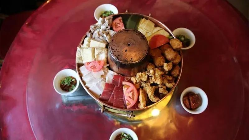 牟定县共和镇北塔村手工特制的铜锅,是烧煮、盛放牟定铜炊锅菜的唯一器具,锅体中端留足放进木炭、明火燃料的空间,边沿一圈煮入荤素菜品。牟定铜炊锅菜有其独特的入菜程序,先放洋芋茨菇等素食绿菜,再用肉品覆盖其上,最终加入事先备好的特制底汤,经铜锅中心往外传热慢煮而成。