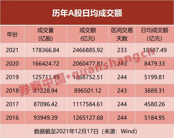 Wind数据显示,截至12月17日,今年以来平均每个交易日的成交额达到10587万亿元,日均成交额破万亿,相比过去几年明显放大。而2020年的日均成交额仅8400余亿元,2019年更是日均成交额仅5200亿元。