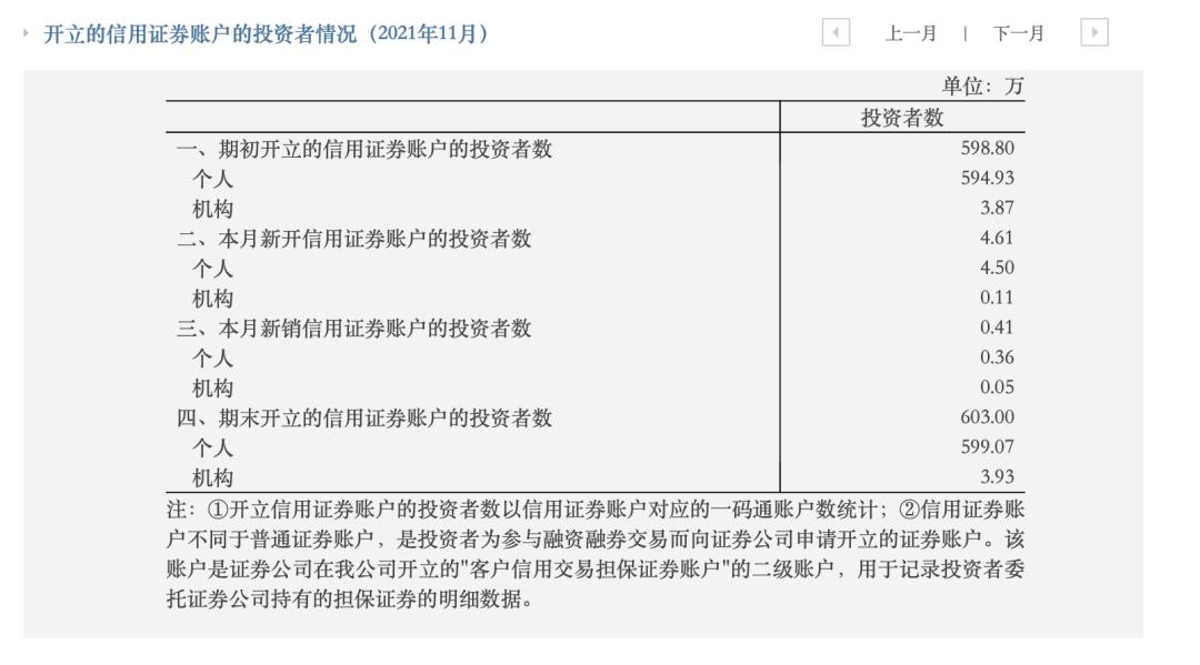 具体为,2021年11月,新开个人信用账户为4.50万个,新开机构信用账户数量0.11万个。至2021年11月末,共有603万个两融账户投资者(个人+机构),首次突破600万个,较2020年末增加了约44.93万个。