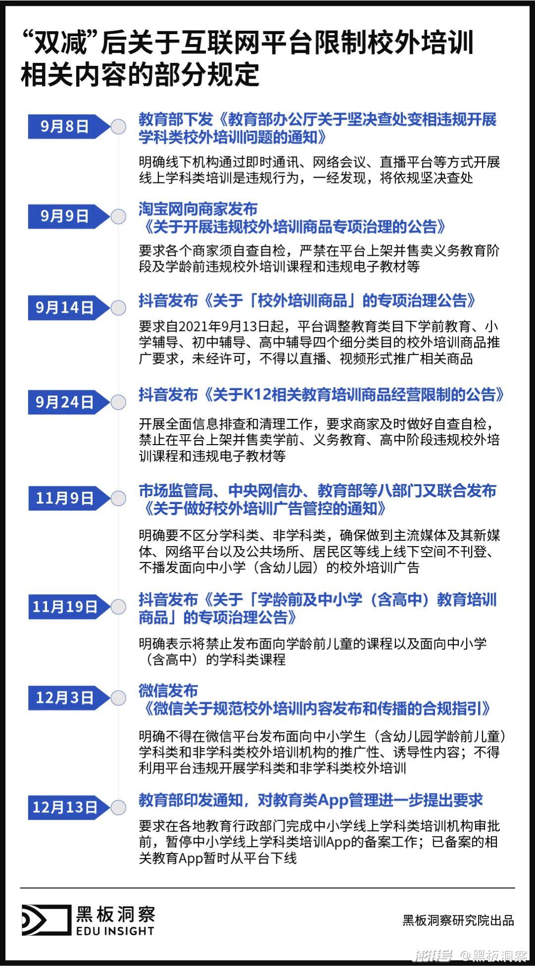 到了 11 月份,市场监管局、中央网信办、教育部等八部门又联合发文,明确要不区分学科类、非学科类,确保做到主流媒体及其新媒体、网络平台以及公共场所、居民区等线上线下空间不刊登、不播发面向中小学(含幼儿园)的校外培训广告。同时提到,要将校外培训广告管控纳入互联网信息管理的重点内容,对于违反政策代理、制作、刊登、播发校外培训广告的电商平台和其他互联网企业,要坚决依法处置。