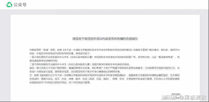“会迟到,但绝不会缺席”。除淘宝、抖音、京东这些互联网电商平台外,微信这样的社交平台也在本月加入了“限流”大军的队伍。12 月 3 日,微信团队发布《微信关于规范校外培训内容发布和传播的合规指引》,内容主要有两点,一是不得在微信平台发布面向中小学生(含幼儿园学龄前儿童)学科类和非学科类校外培训机构的推广性、诱导性内容,以及“贩卖教育焦虑”、承诺迅速提高考试成绩的内容;二是不得利用微信平台面向中小学生(含幼儿园学龄前儿童)违规开展学科类和非学科类校外培训。