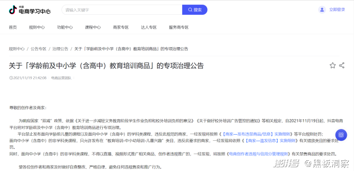 其中,在最近的一则公告(《关于「学龄前及中小学(含高中)教育培训商品」的专项治理公告》)中,抖音明确表示将禁止发布面向学龄前儿童的课程以及面向中小学(含高中)的学科类课程;面向中小学(含高中)的非学科类课程,不得以直播、视频形式推广相关商品,只允许发布在“教育培训-中小幼培训-儿童兴趣”类目。违反此规范的商家,一经发现将按照平台规则处罚。