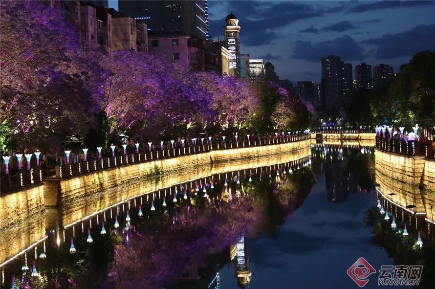 昆明滇润公司相关负责人介绍,此次对桃源广场、码头及南起双龙桥、北至油管桥全程4.62公里的盘龙江航道夜游景观进行了提升改造,依托自然文化景观、梦境蓝花楹、艺术装置(网红打卡),通过水幕、光影秀、激光等特效,结合盘龙江夜游灯光亮化,打造“历史文化特色鲜明、商业氛围浓厚、宾客游人流连忘返”的城市消费夜经济,活化展示“一条江、一座城、一个时代的记忆”,营造良好夜间经济氛围,打造盘龙江畔桃源夜色——重拾昆明“水城记忆”核心品牌。