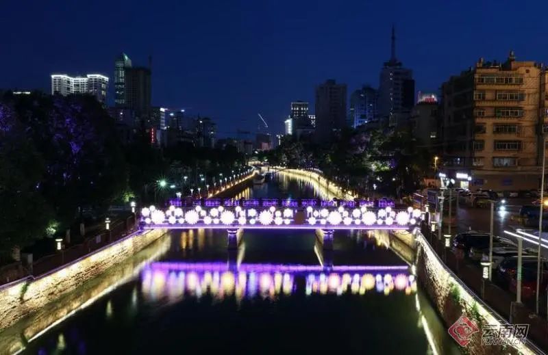 12月17日,昆明滇润公司对盘龙江航运、夜游进行了试航,当天19点左右,盘龙江双龙桥至油管桥段灯火通明,各式投影灯、艺术灯齐亮,吸引了大量市民停下脚步观赏、拍照。