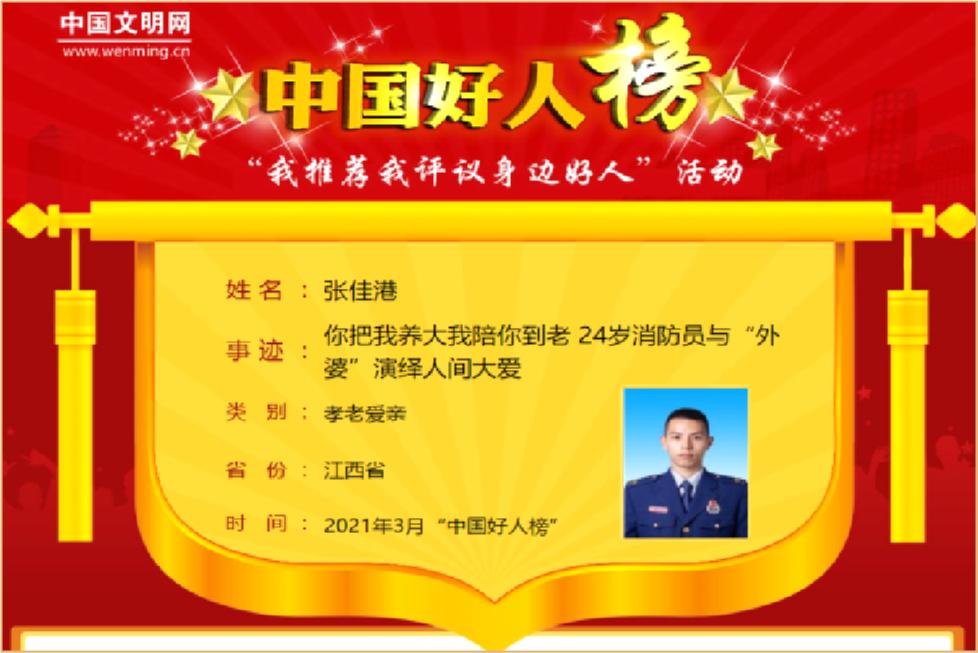 今年以来,身着火焰蓝制服的张佳港与身穿白色婚纱的“外婆”唐才英的婚纱照在网上热传,他与“外婆”背后的故事感动无数网友。中央文明办发布2021年3月“中国好人榜”,张佳港荣获孝老爱亲类“中国好人”。