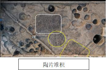 此次发掘还发现了大量的陶片堆积。在“围墙”内的东发掘区中部,清理出四片形制规整、性质奇特的陶片堆积,其包含物以陶片为主,夹杂有骨头、烧土块、石块和石器残块等杂物。其填土不像路土,剖面形状又与坑类遗存有别,平面形状则或为方形,或为圆形。