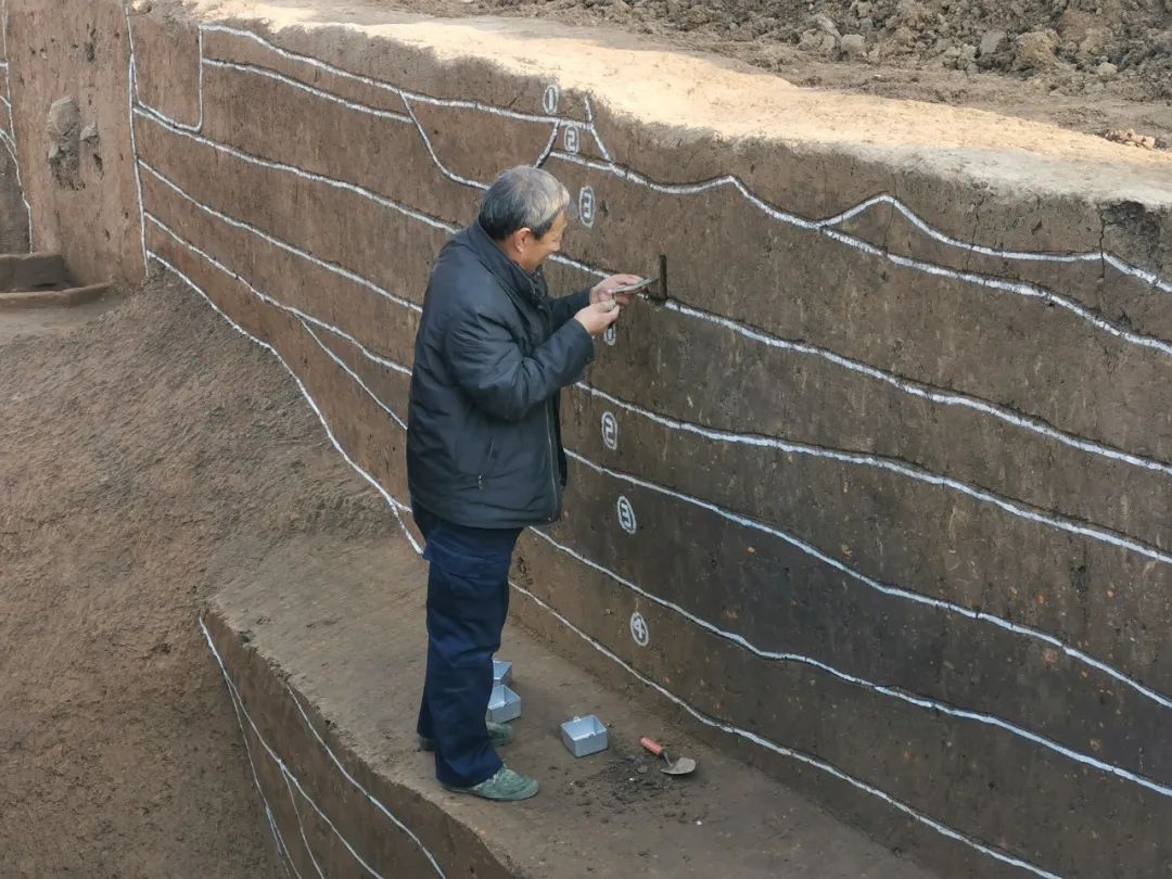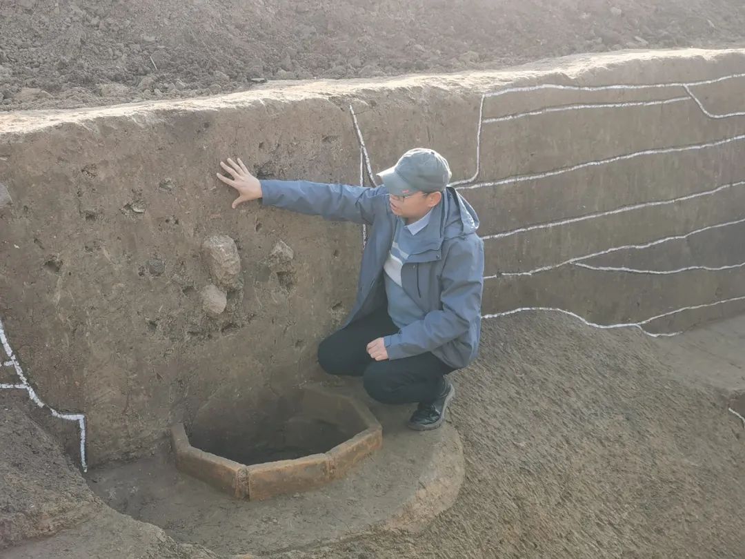 走近仍保留的壕沟遗址,可以清晰地看到古时壕沟的形状,不同时期的文化堆积被白线标示出来,足足有9层,工作人员正在取土样,以便检测和进行多学科研究。在壕沟的一侧,有一口汉代的水井,井边立有一圈汉砖。