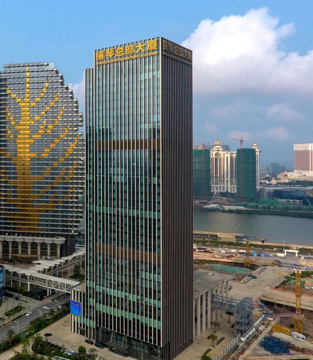 珠海横琴总部大厦(一期)项目位于横琴粤澳深度合作区的口岸服务区核心位置,与澳门一河之隔,为横琴首座综合商务楼宇,荣获“国家优质工程奖”,现为全国首座跨境办公试点楼宇,目前有二十余家澳资企业进驻,服务于澳门经济的适度多元化发展。