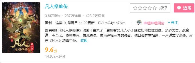 据悉,动漫《凡人修仙传》改编自同名网络小说,2020年在B站上线播出。到目前为止,《凡人修仙传》在B站的播放量已经达到3.6亿,14.6万人打出了9.6的高分。