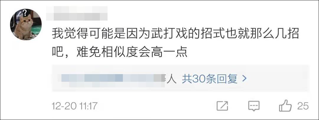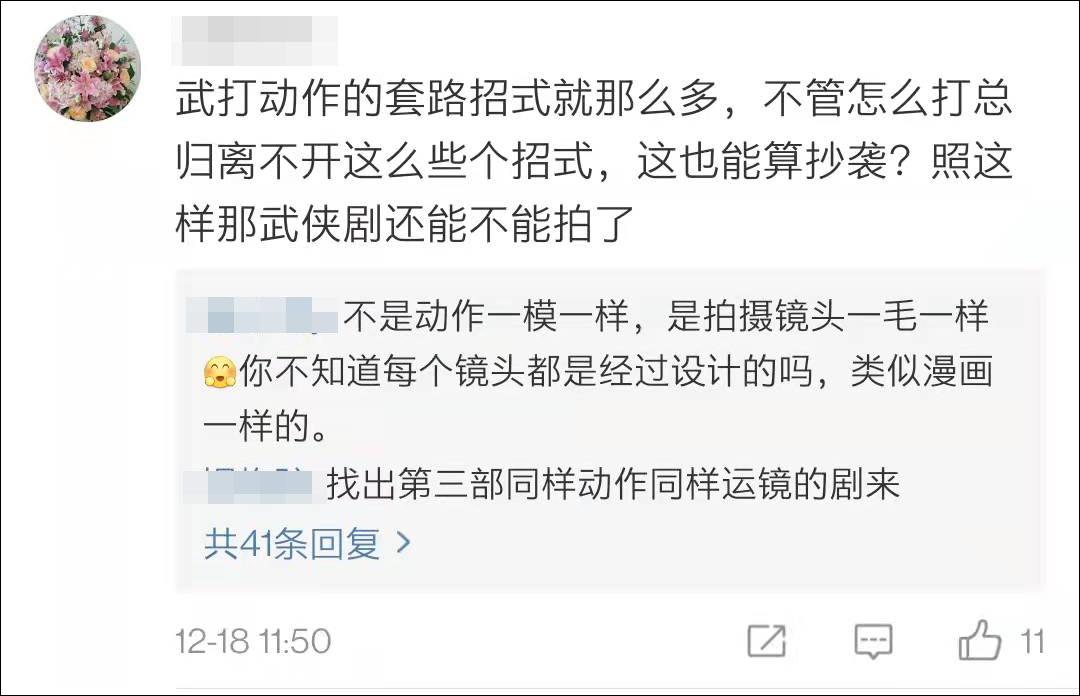 此事引发网络热议。有人发声称:“可能是因为武打戏的招式也就那么几招吧,难免相似度高一点。”