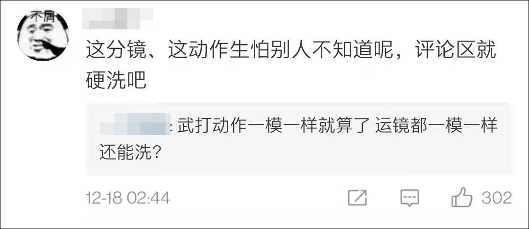 这种论调遭到众多网友反驳:“武打动作一模一样也就算了,运镜都一模一样还能洗?”