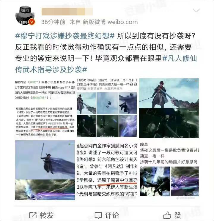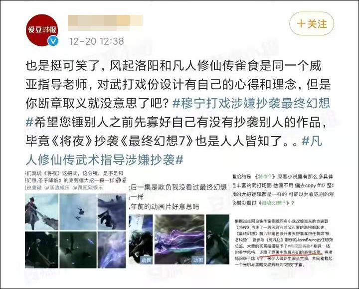 值得一提的是,就在《风起洛阳》被曝打戏抄袭《凡人修仙传》引发关注时,穆宁的另一部的作品《将夜》就被爆料抄袭《最终幻想》。