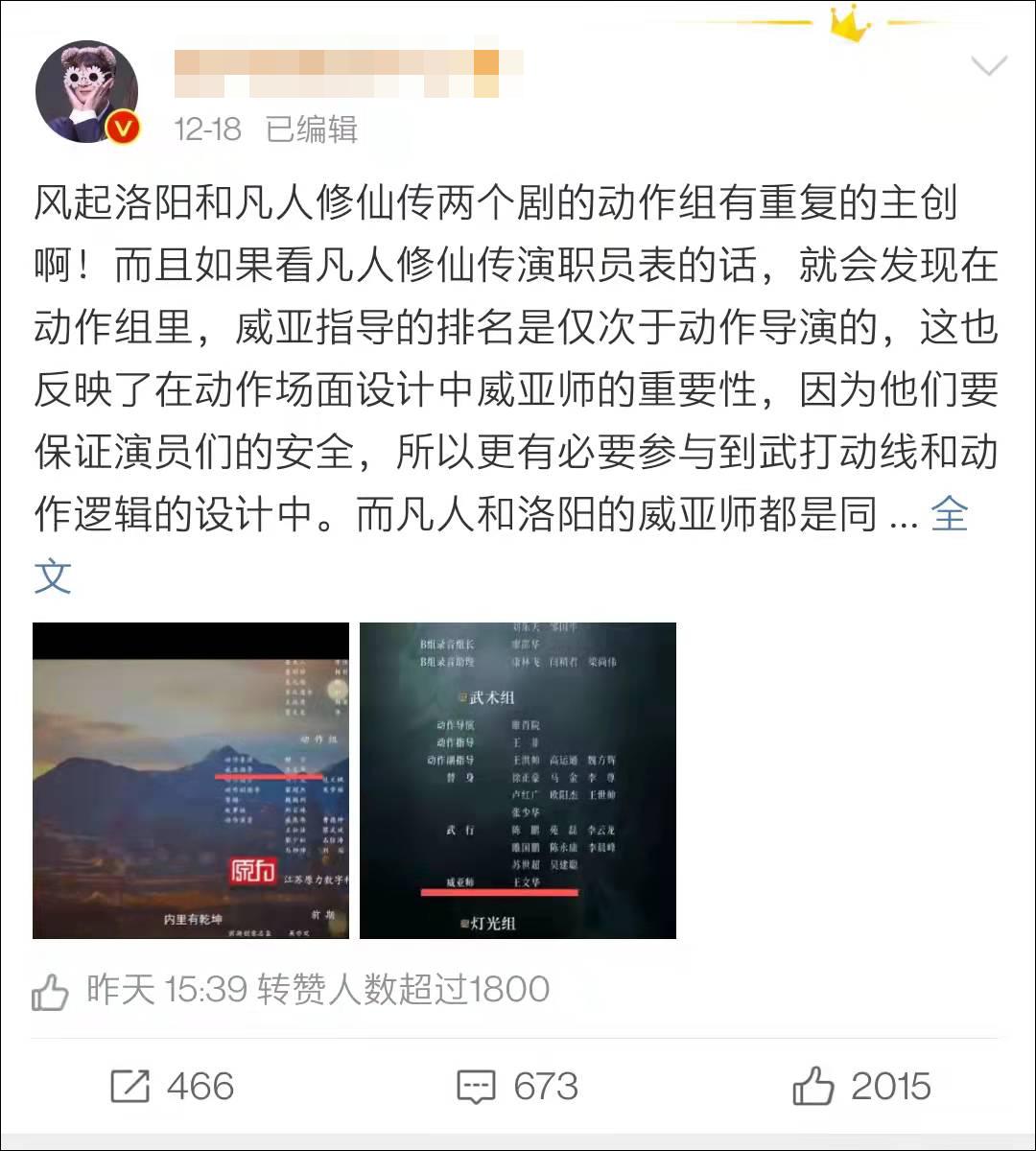 早在16日,《凡人修仙传》动作导演穆宁就表示《风起洛阳》的部分动作戏抄袭了他们的侧拍。