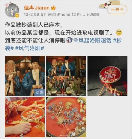 剧集刚开播时,剧中道具团扇抄袭中国刺绣艺术家、服装装饰设计师@佳冉Jiaran 作品,让设计师本人亲自下场发文指责。最终剧方道歉,称制作团队在道具制作过程中未做好溯源工作。