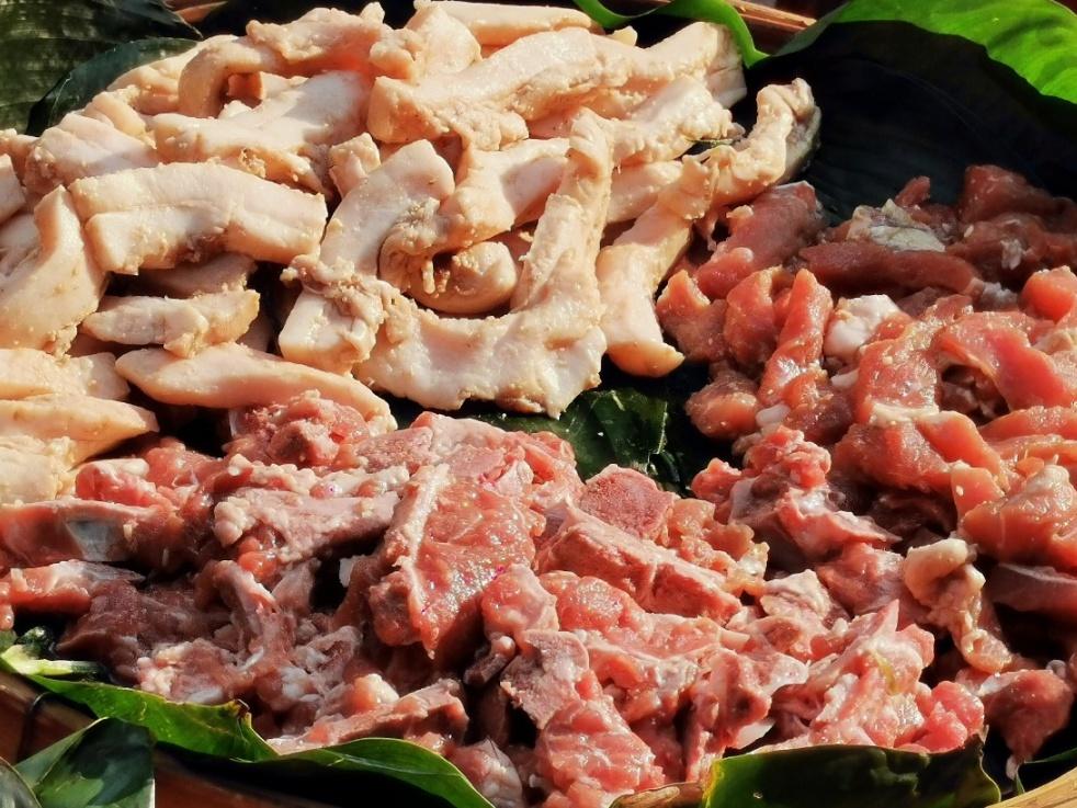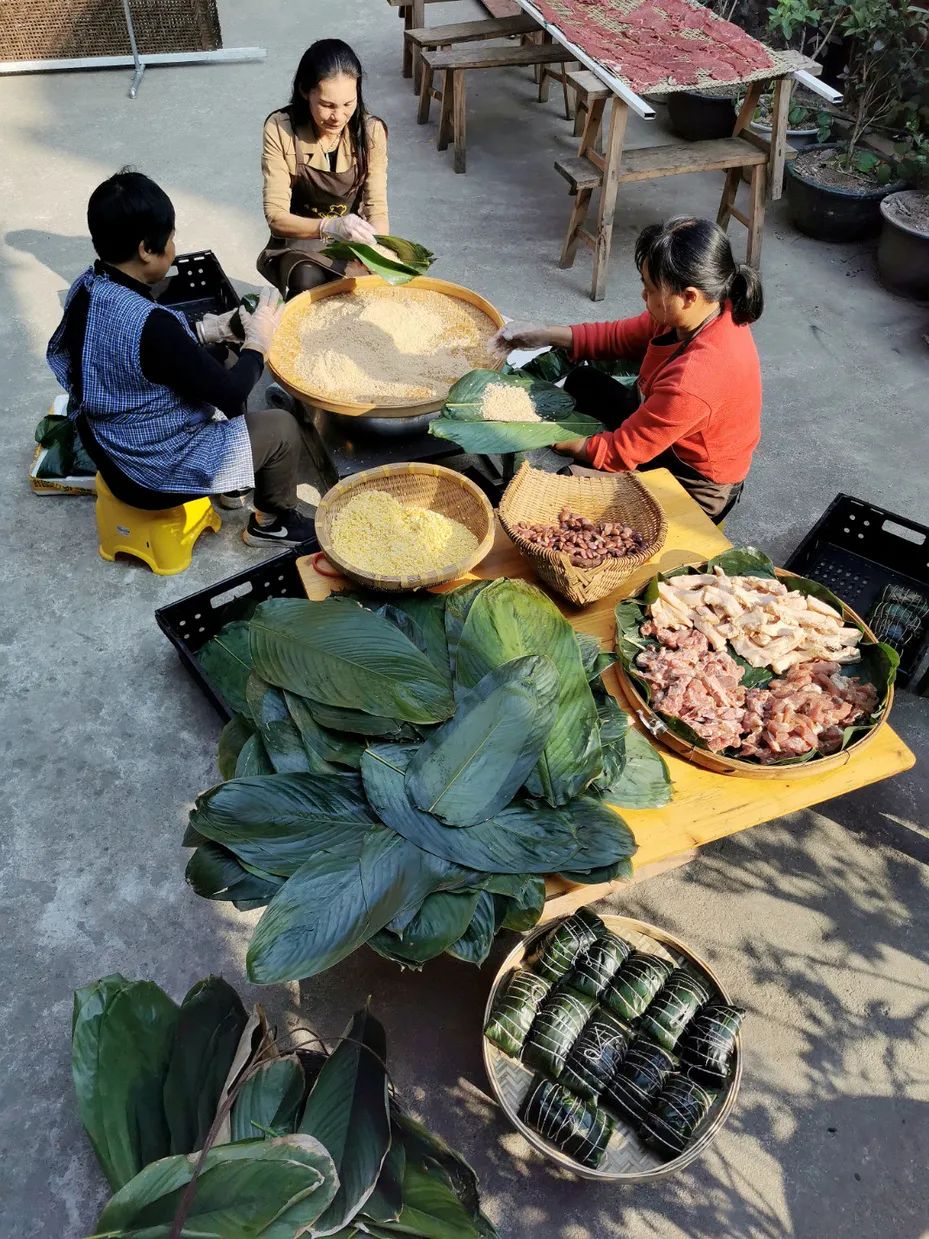 一大早,蒋丽珍的母亲便泡好糯米、绿豆、荷包豆,五花肉、排骨等也早早腌制好,一大家人坐在小院里,围着各种馅料,一起动手包粽子。