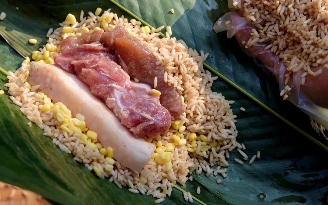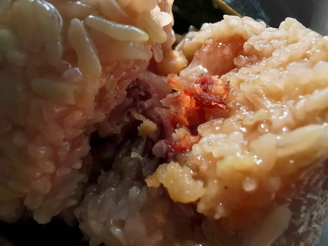 米粒间也是满满香黏的油汁,香味扑鼻而来,让人食欲大开。肥瘦相间的肉馅,香糯的板栗,清香的绿豆在嘴里交织,三者搭配齿颊生香。五花肉中的肥肉,入口即化,绿豆和荷包豆甜而不腻,糯米软而不黏牙。