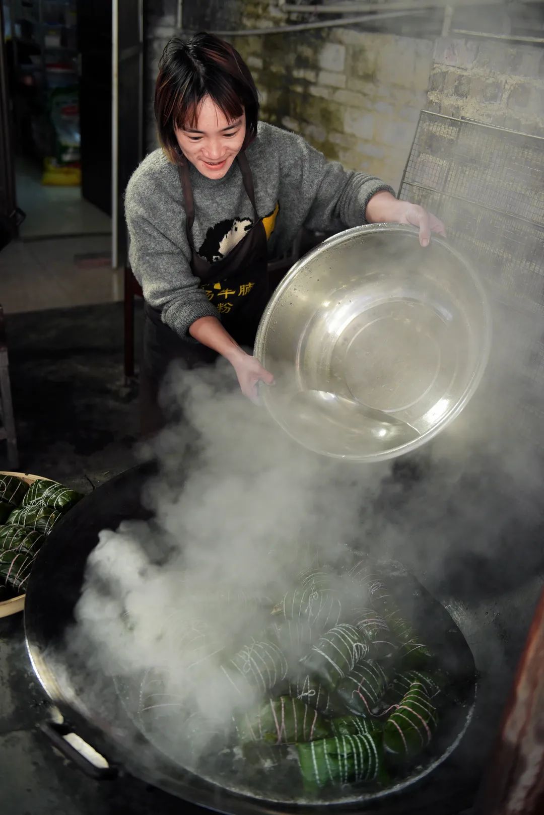 点燃柴火,跳跃的火舌热情地舔着锅底,不久,锅里的水就开了,白色的蒸汽从锅边窜出来。“一大锅粽子,要放在锅里连续熬8个小时才能煮透,”蒋丽珍介绍,熬米粽是一个等待五味调和的过程,必须掌握足够的火候和时间,才能将米粽熬得软糯清香。