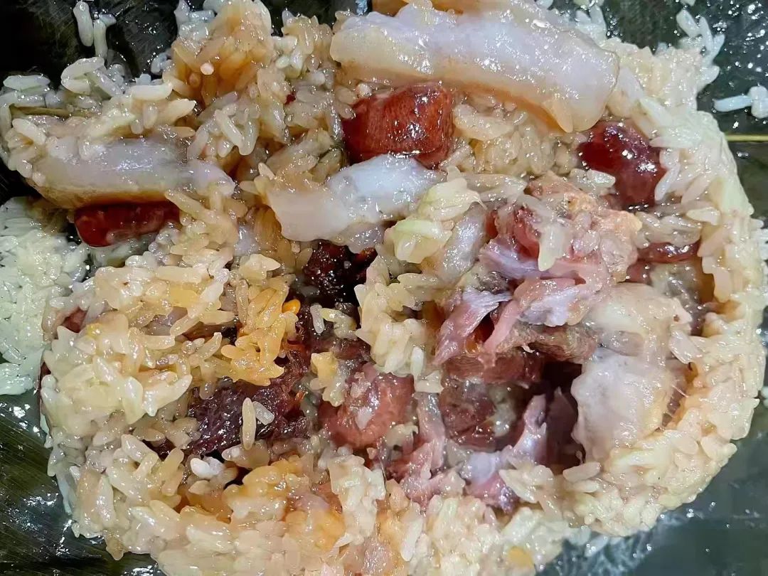 只见米粽上面满满都是米油,还泛着粽叶的淡青色光泽,这时的粽香要比熬煮的时候更加浓郁。粽叶的清香,猪肉和排骨的咸香,搭配荷包豆的微甜,所有的食材经过高温和粽叶的相互作用,融汇在柔软香糯的糯米里,溢口咸香让人沉迷。
