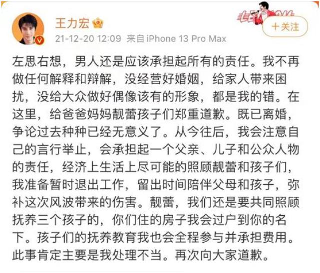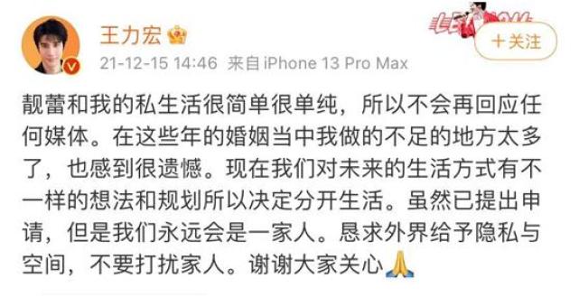 缘起:15日,王力宏发微博承认,已经申请与李靓蕾离婚。