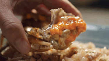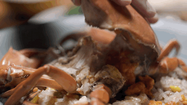 上好的金蟳,切开后蟹黄呈流沙质地,闪烁着赤红色的油光,像极了上好的咸鸭蛋。这样的金蟳,对半切开,放在过年必吃的糯米饭上。米饭吸收了蟹的油脂,也吸收了配料里其他食材的滋味。这么来一口,五脏六腑外加灵魂都震颤了。