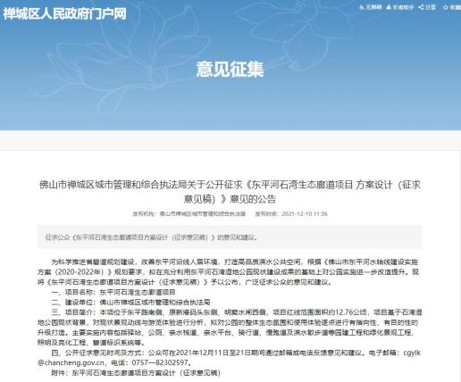 近日,禅城区人民政府门户网发布关于公开征求《东平河石湾生态廊道项目方案设计(征求意见稿)》意见的公告,拟在充分利用东平河石湾湿地公园现状建设成果的基础上对公园实施进一步改造提升。