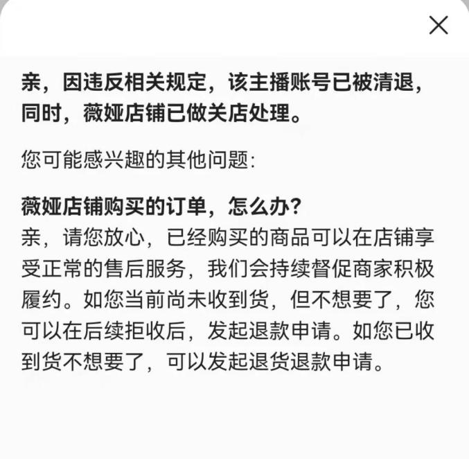 此前,记者曾询问薇娅淘宝店客服是否可以正常购物,客服回应称:“暂时没有接到具体通知。”如今,薇娅的淘宝店也无法在主页入口中找到,据淘宝官方客服反馈称,薇娅店铺已做关店处理,已经购买的商品有正常售后服务。