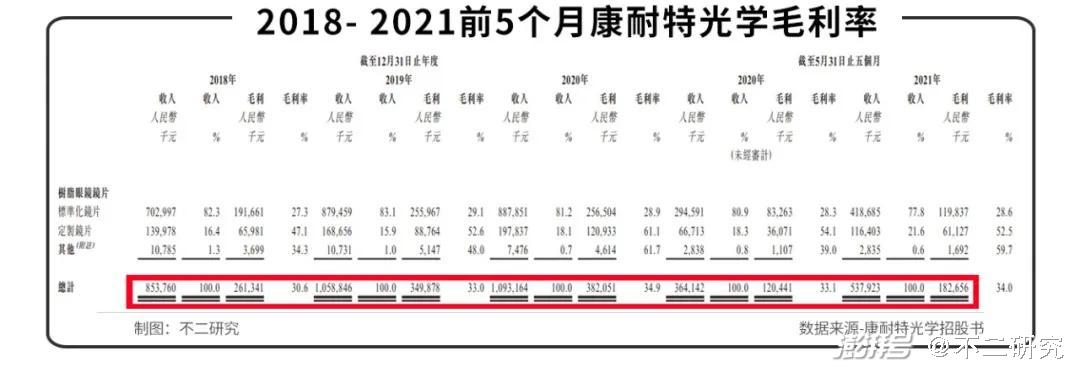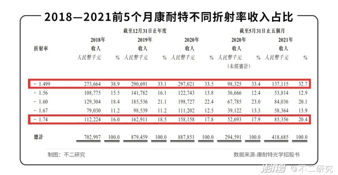 招股书中,康耐特称其为国内少数能够供应1.74折射率的树脂镜片制造商,2018-2021年前5个月,1.74折射率镜片的在同期标准化镜片的收入占比为16%、18.5%、17.8%、20.4%。