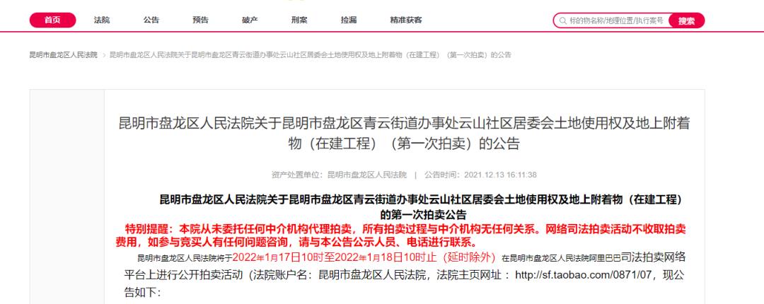 近日,昆明市盘龙区人民法院发布“关于昆明市盘龙区青云街道办事处云山社区居委会土地使用权及地上附着物(在建工程)(第一次拍卖)的公告”。这意味着,从2016年停工至今的巨和齐泰城,终于有了新进展。