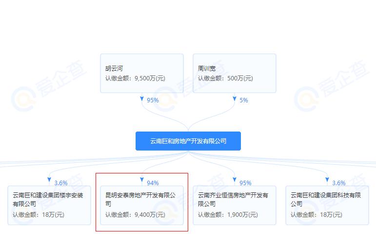 企查查资料显示,昆明安泰房地产开发有限公司的控股股东是云南巨和房地产有限公司。成立于2001年的云南巨和地产是云南本土历史较知名的开发商,在昆明开发建设的知名楼盘有金色家园小区、12棵橡树庄园、茉莉唐朝花园小区、美术馆花园小区等。
