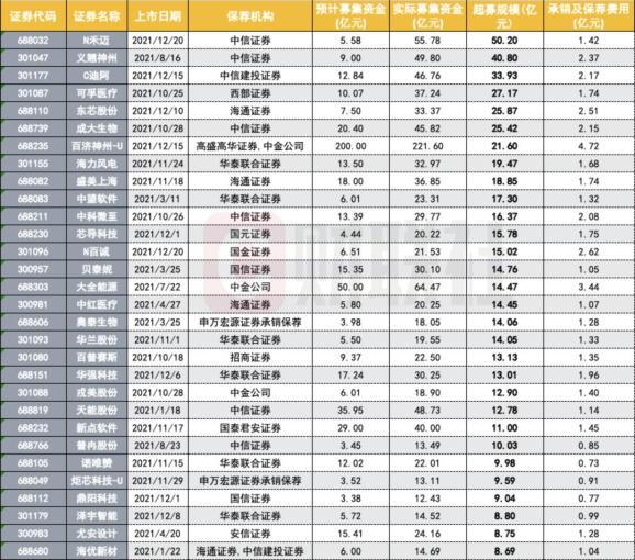 其中,有24家企业超募规模超过10亿元,超额募资中位数为25.64亿元,保荐机构中,中信证券、华泰联合证券、海通证券、中金公司保荐的超募IPO项目偏多。