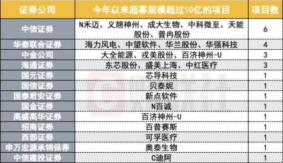 此外,中信建投证券、国信证券、国泰君安证券、申万宏源承销保荐、招商证券、国金证券、国元证券、高盛高华证券、西部证券均有一个项目上榜。